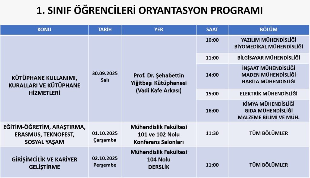 Bölümümüze yeni kayıt yaptıran öğrencilerimiz için 29 Eylül 2025 Pazartesi günü 11:00 – 12:30 saatleri arasında Mühendislik Fakültesi Konferans Salonu‘nda oryantasyon ve tanışma programı yapılacaktır. Tüm birinci sınıf öğrencilerimizi etkinliğimize bekliyoruz.